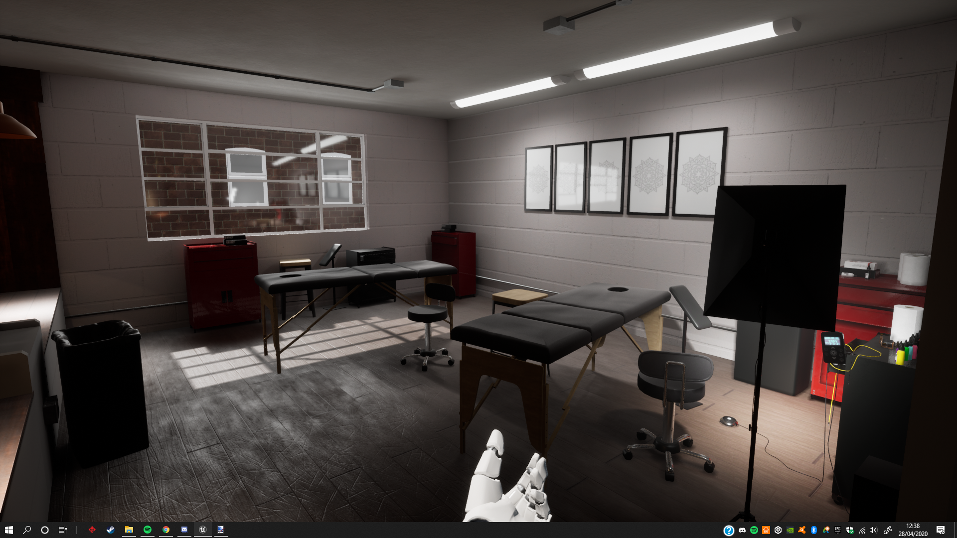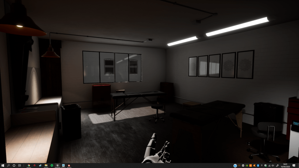 One of the things I’ve been working on has been the lighting. When getting feedback from tutors the main things being pointed out was that my scene was too dark and there were lighting artefacts. To fix these issues I increased the resolution of my lightmaps and either altered the intensity of my lights or added more lights into the scene. I have also used IES profiles to achieve more realistic lighting patterns. The screenshot below shows my project on the 16/04/2020. Lighting the scene correctly has had a huge visual impact.